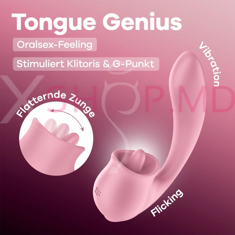 Indiferent dacă este vorba despre plăcere externă sau internă – acest jucărie erotică știe exact ce să facă. Cu 8 moduri de lins și 8 programe de vibrație, Tongue Genius îți stimulează simultan clitorisul și punctul G, oferindu-ți orgasme care dăinuie mult timp după utilizare.